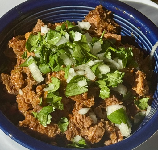 Cooked for about 2 hours on a simmer and served with rice (there’s actually a big mound of rice under that pork it’s not just a bowl of meat) and the onion/cilantro mix! also some cubed avocado that didn’t make the portrait.