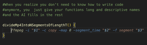 I’m curious if you succeeded with this approach here - have you gotten your LLM to produce a bash function which you can use without needing to understand how to specify an ffmpeg filename pattern yet?