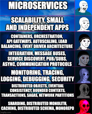 I think currently I’m still heavily in favor in microservices in a project of our scale as it easily let’s us enhance, trash, or reimplement different areas of the app; but man is it a pain in the ass to manage sometimes 😂